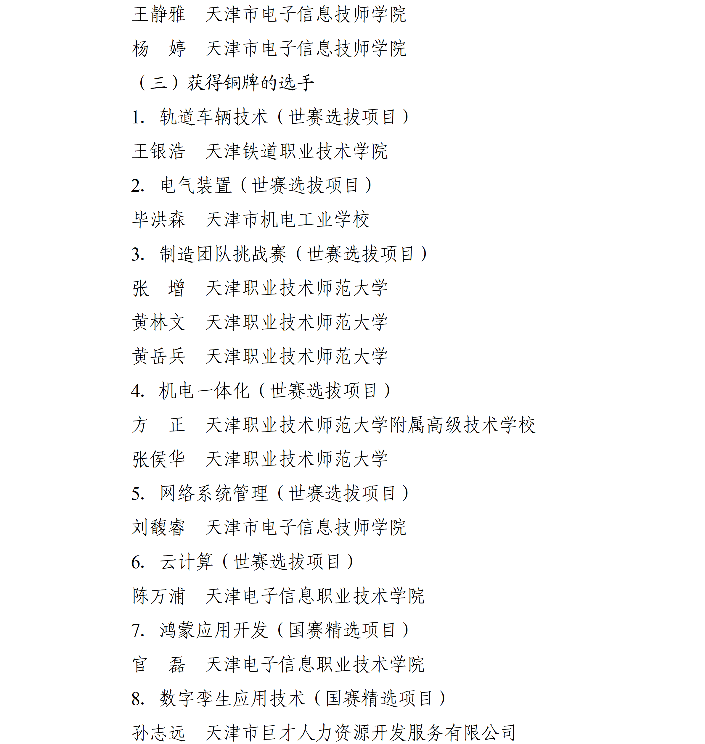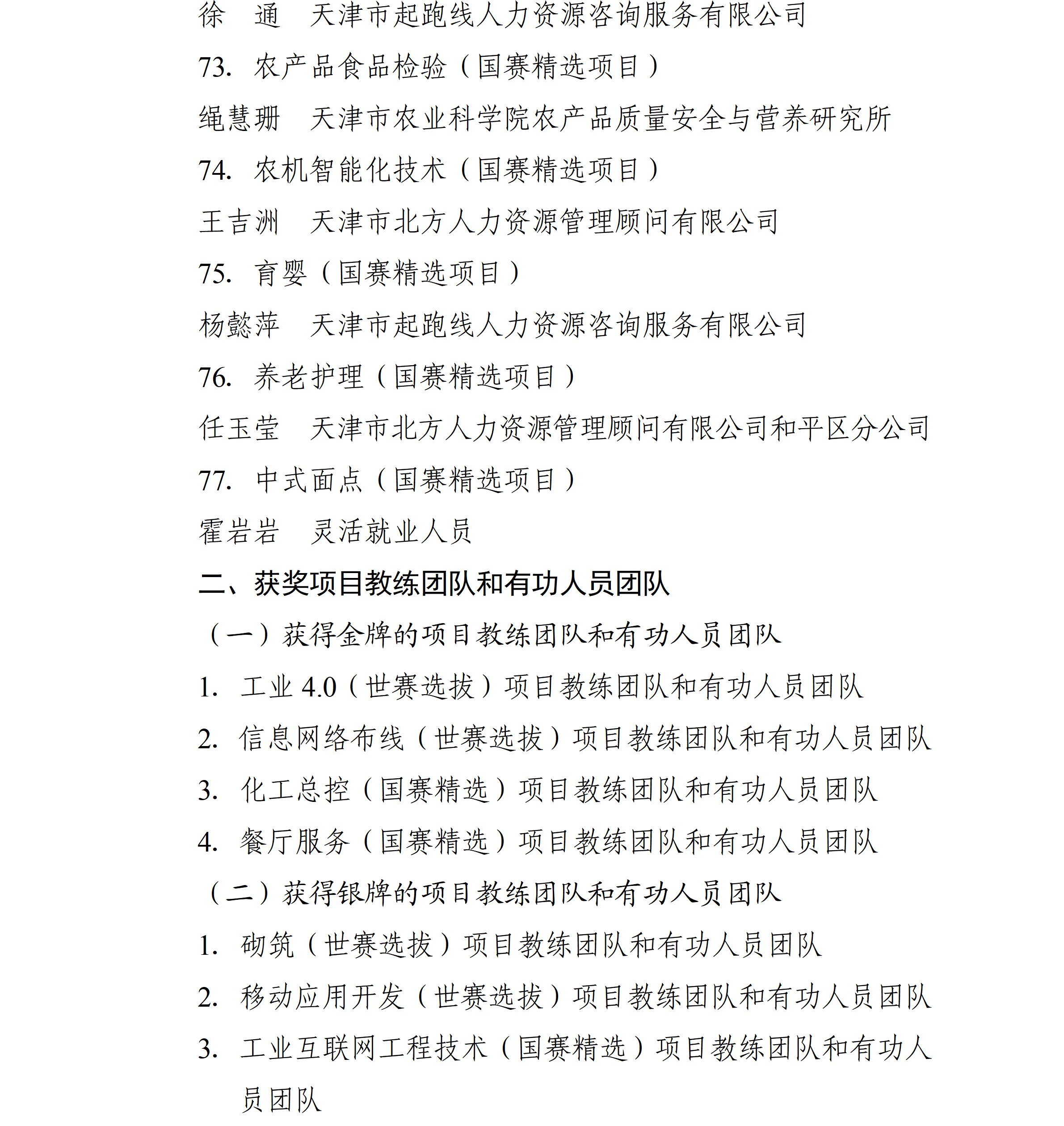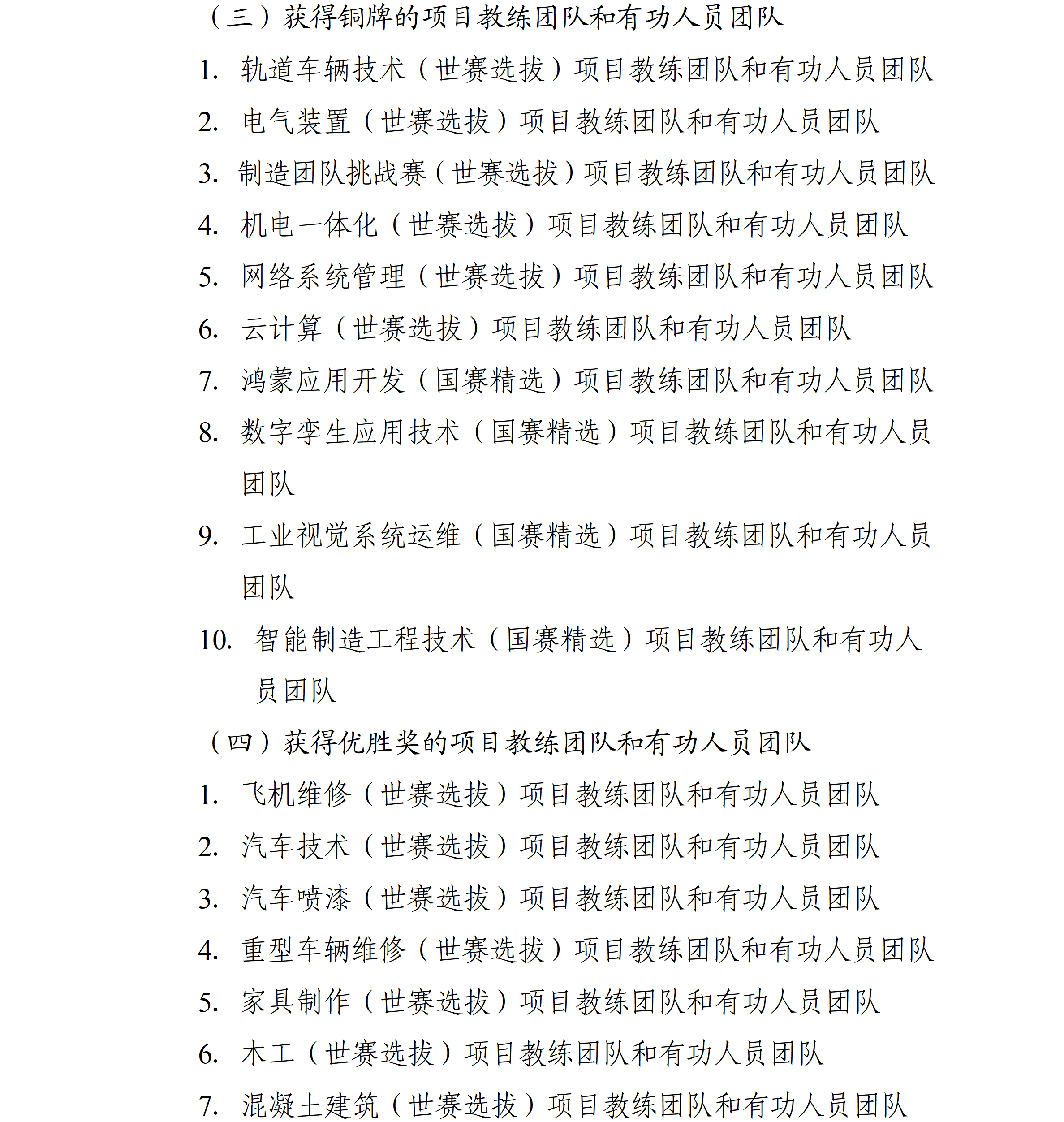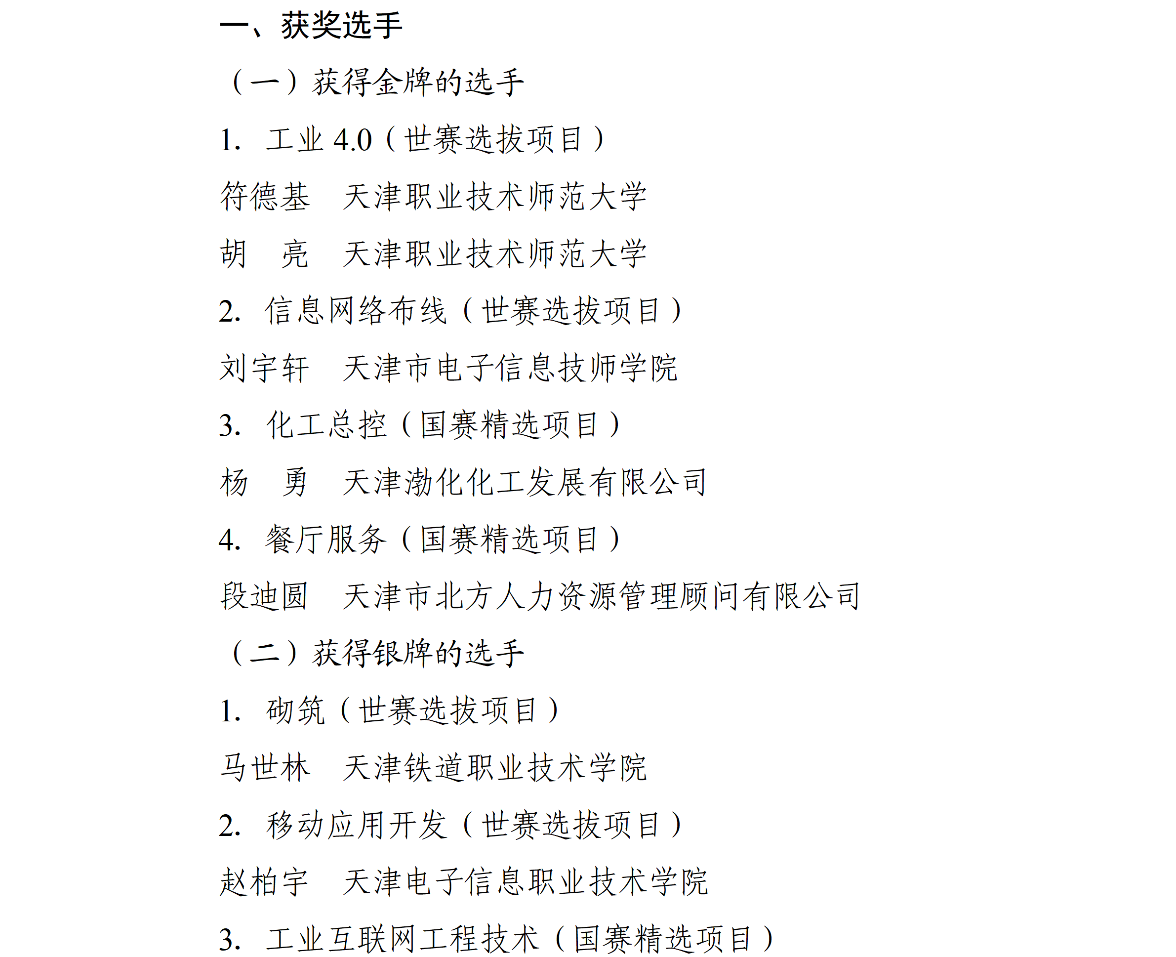 中华人民共和国第三届职业技能大赛于2025年9月19日至23日举办,本市派出116名选手参加全部106个赛项的角逐,4个项目摘得金牌、3个项目夺得银牌、10个项目获得铜牌,77个项目取得优胜奖,特别是“工业4.0”、“信息网络布线”等项目连续三届蝉联冠军。为大力弘扬劳模精神、劳动精神、工匠精神,动员激励本市广大劳动者特别是青年一代建功立业、创新创造,市人民政府决定对本市获奖选手、获奖项目教练团队和有功人员团队给予表扬和奖励,现通报如下: